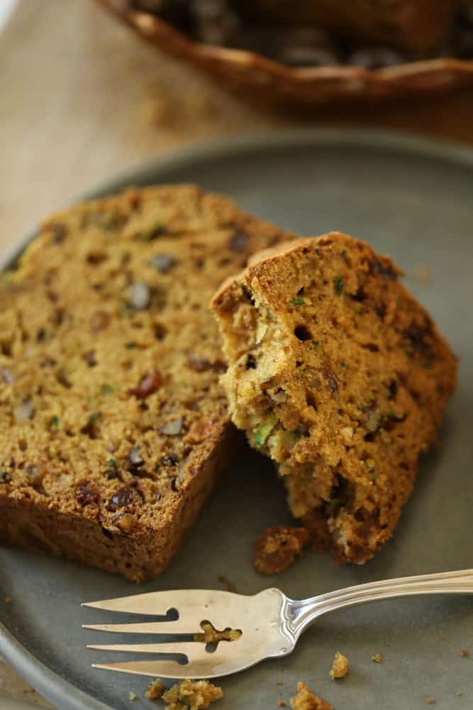 It’s light and moist and flavored with just the right amount of spicesโthis is what makes zucchini bread so good, in my opinion. The batter needs lots of spices and mix-ins too! I use two types of raisins and crunchy walnuts. But you could also add some chopped bittersweet chocolate and shredded unsweetened coconut too!