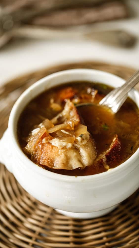 This Easy French Onion Soup is a classic comfort food recipe made with caramelized onions, rich beef broth, and melted Gruyรจre cheese. Perfect for make-ahead entertaining or cozy fall dinners.