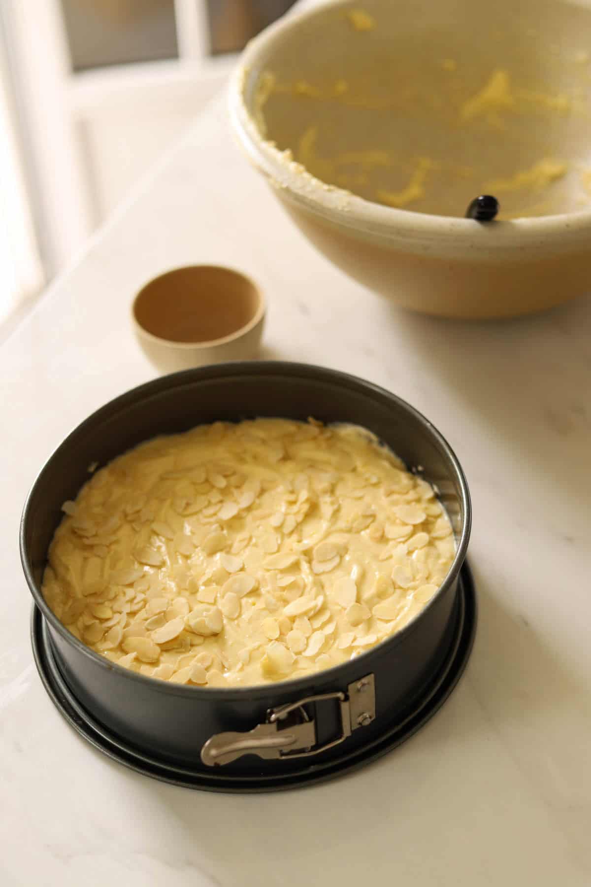 - Top with a sprinkle of almonds, evenly distributed over the cake.